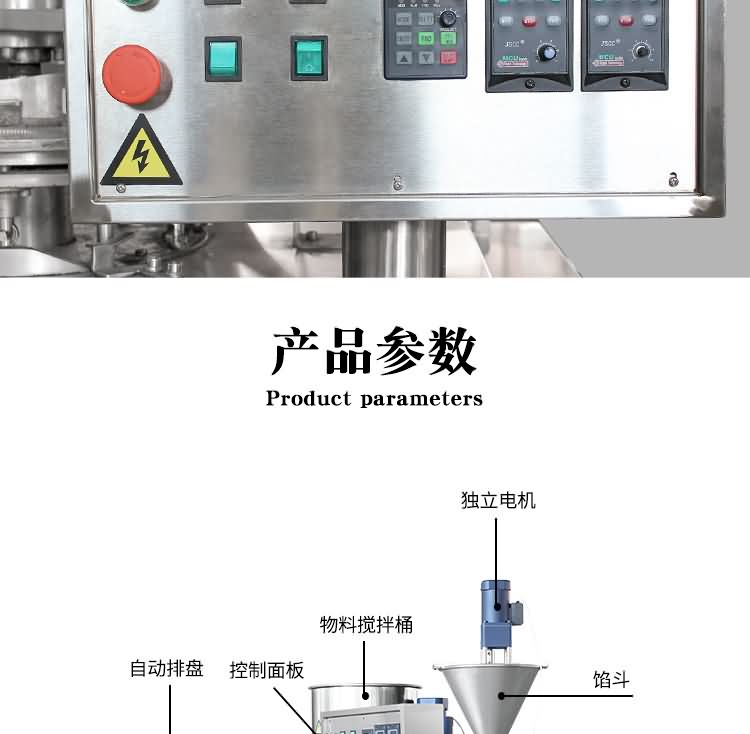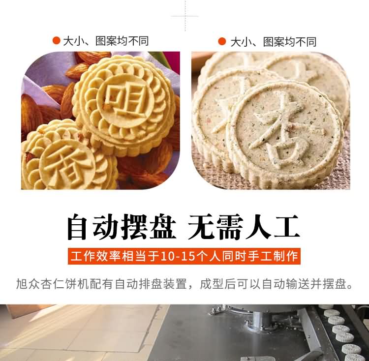 ◆杏仁餅機配有自動排盤裝置,成型后可以自動輸送并擺盤。適用于花生、芝麻等的干性物作為夾心材料,做出多種不同口味夾心的粉餅。也可以關閉夾心功能,做不夾心的杏仁餅、炒米餅、綠豆餅、桂花炒年糕等粉餅。