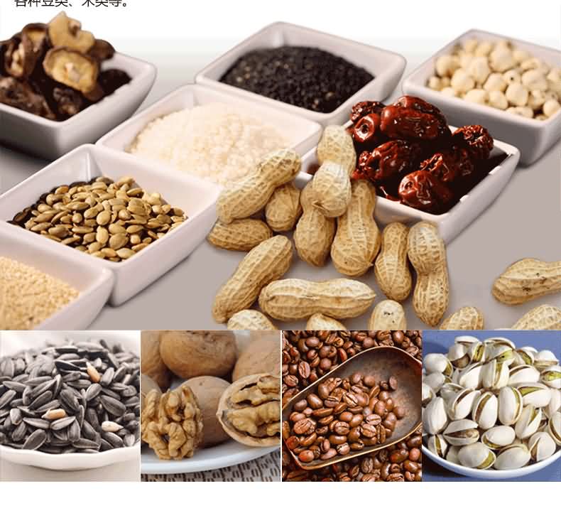 7.適合加工各種干果和堅果類,如;板栗、花生、瓜子、松籽、榛子、杏仁、菜籽、咖啡豆、紅棗、芝麻、、核桃、各種豆類、麥類、米類等。適用于在各大商場、超市、食品專賣店、連鎖店、街道小吃等人口密集區等處定點經營和加工。是您創業致富的好幫手。