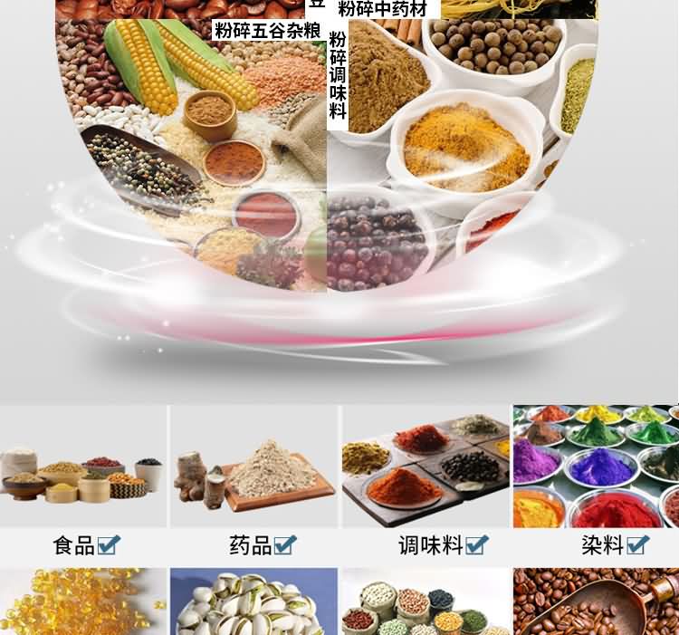 二代超微粉碎機組能處理如化學制品、食品、藥品、化妝品、染料、樹脂、殼物等多種物料的粉碎及分級,該機能對大米、白糖、各種豆類、沉香木、花椒、胡椒、咖啡豆、可可豆、茴香、八角、桂皮、孜然、豆蔻、百里香等各種物料起到良好的粉碎效果。