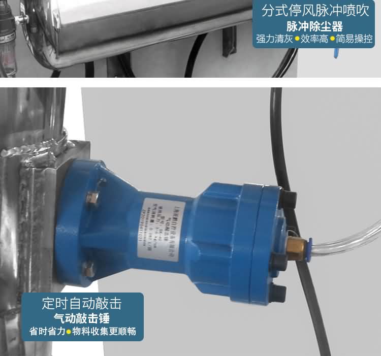 以電機帶動傳動軸高速運轉,物料進入粉碎腔時由前排錘頭進行初次粉碎,形成細小顆粒進入活動錘盤內,經錘盤內的活動錘片及風葉對物料的二次粉碎,最后流向分級腔,由分級盤對物料進行最后的粉碎分級,合格的產品通過分級盤縫隙,經管道進入沙克龍收集器,由卸料器收入接料容器。含塵的氣體則進入除塵柜,經濾袋過濾,粉塵被阻隔在柜中,由脈沖裝置震打而落入收料箱中,凈化的后的氣體經排風口排出箱體。