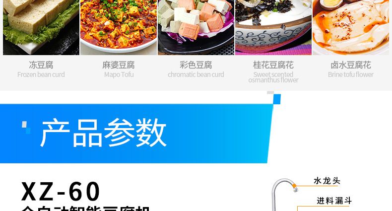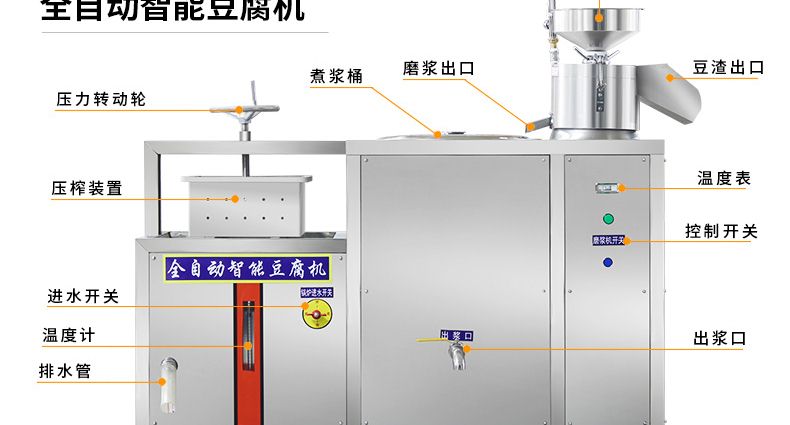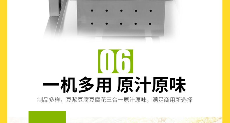 全自動(dòng)豆腐機(jī)系列,一機(jī)多用:可生產(chǎn)豆腐系列產(chǎn)品:?jiǎn)紊郏希┒垢⒍嗖识?腐、單色豆腐皮、多色豆腐皮、彩色豆腐干、豆?jié){、豆花等豆制品制作,還可以與其他設(shè)備和工藝配套生 產(chǎn)更多的豆制品。