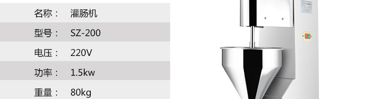 SZ-200灌腸機,適合灌制各種香腸、紅腸、臘腸及糊狀制品。本機使用敞開式不銹鋼料斗,適用于連續添加物料;與灌裝手接觸部件全部采用優質不銹鋼制作以防生銹;該機自動貨程度高,技術先進、性能穩定、操作簡便、工作效率高,具有不破壞物料成份,保質、保鮮等特點。