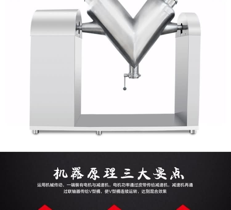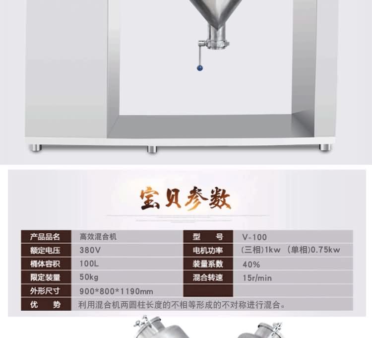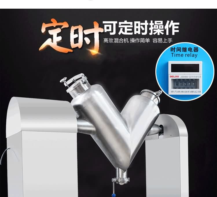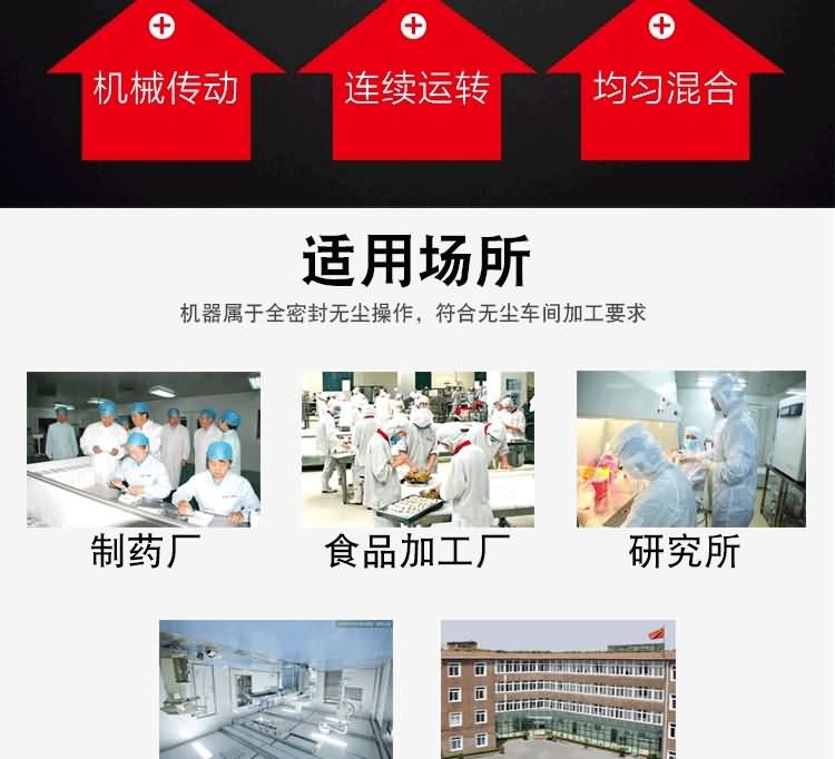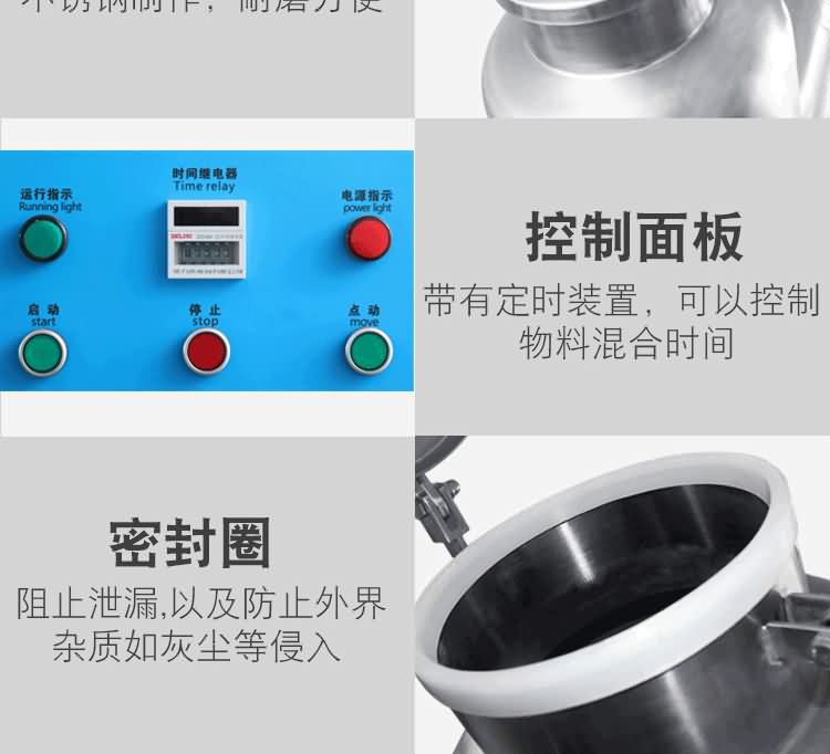 本設備采用手工進料和封閉碟形閥出料結構,可以實行無粉塵操作,同時物料在混合時沒有機械擠壓和強烈摩擦,可以保持物料顆粒完好無損,本機混合筒采用不銹鋼制造,對混合物料無任何污染。另外,本機還裝有定時裝置,可以控制物料的混合時間。