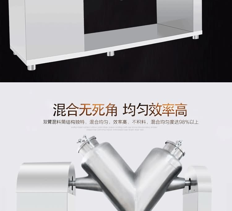 本機通過減速機構帶動筒體旋轉,利用混合機兩圓柱筒長度的不相等形成的不對稱進行混合,當混合機運動時,物料從分解到組合,由于勢能的不同,就產生了一個橫向力,推動物料進行橫向交流。當物料從組合到分解,由于物料平面不同,就產生了一個橫向力又推動物料進行橫向交流。筒體旋轉一周,約使25%的物料從一個筒體流向另一個筒;同時筒體旋轉時又使物料產生徑向流動,這樣物料進行橫向、徑向分解,組合交替進行,使物料達到非常均勻的效果。