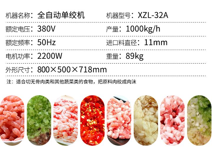 XZL-32A單絞機吸取同行之優點,改進新型絞肉切肉機械,它能切豬肉、羊肉、牛肉、魚及其它各種肉類、所切肉片厚度適中切片效率高,是餐廳、賓館、酒樓、單位食堂等絞肉切肉的理想機械,該機外形獨特,操作方便,維修簡單,工作效率高,在同行業中處領先地位,與食物接觸部分均采用不銹鋼制造符合食品衛生標準。