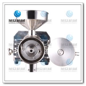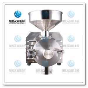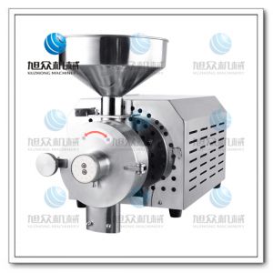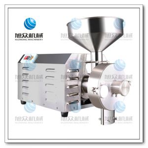 磨粉機的電機啟動運轉時,連接軸以及套在連接軸上的磨盤一起運轉。待磨物料從料斗進入磨粉套,磨盤的絞龍和磨粉套之間的相對運轉,破碎力使物料絞碎成小塊顆粒,絞碎后的小顆粒在磨盤絞龍的螺旋運動下被帶進兩塊磨片中間,磨片齒紋的相對運轉,使物料在短時間內被粉碎成細小的粉狀顆粒,粉從磨片的齒溝流出,甩向四周,同時被裝在磨盤上的刮粉板帶下,從出粉口流出來。