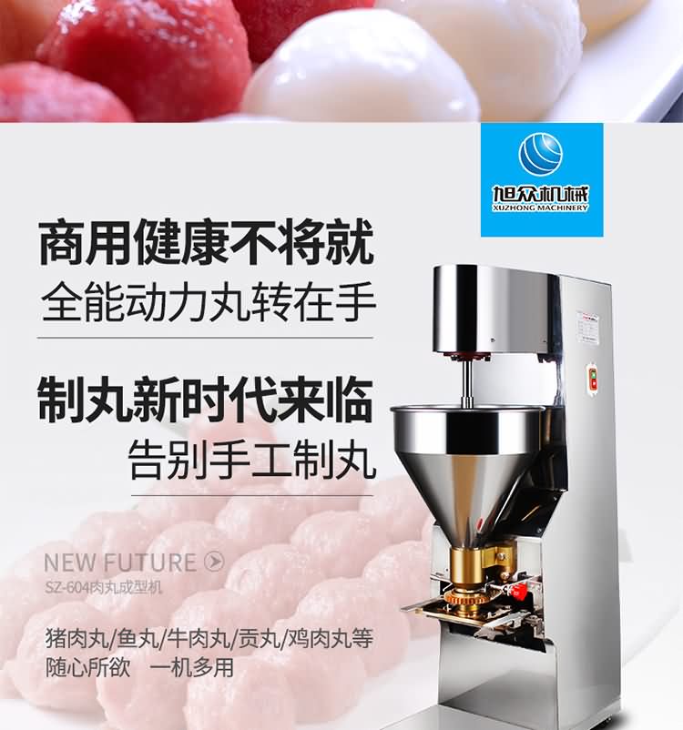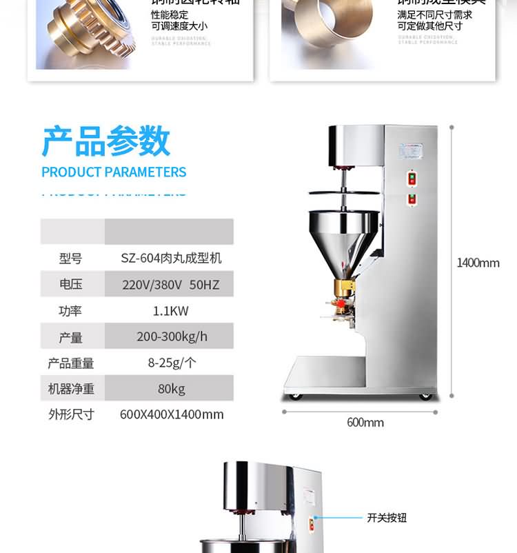 SZ-604肉丸成型機,肉丸成型機采用不銹鋼材質,丸子直徑可達15-35mm,可以制作各類爽脆,有韌性、有彈性的豬肉丸、魚丸、牛肉丸、貢丸、雞肉丸等