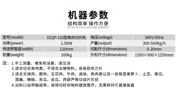 XZQP-120型熟肉切片機(jī),XZQP-120型熟肉切片機(jī)能將叉燒肉、臘肉、五花肉、牛肉、鹵味、熟肉類以及一些根莖類蘿卜,土豆,黃瓜,蓮藕,辣椒,苦瓜,絲瓜,西葫蘆等切成片形狀;
