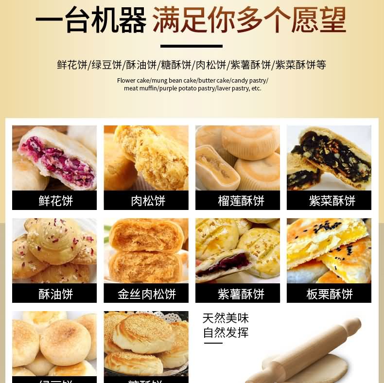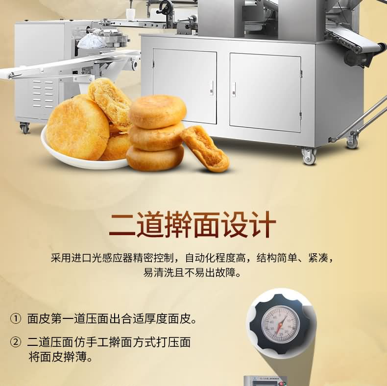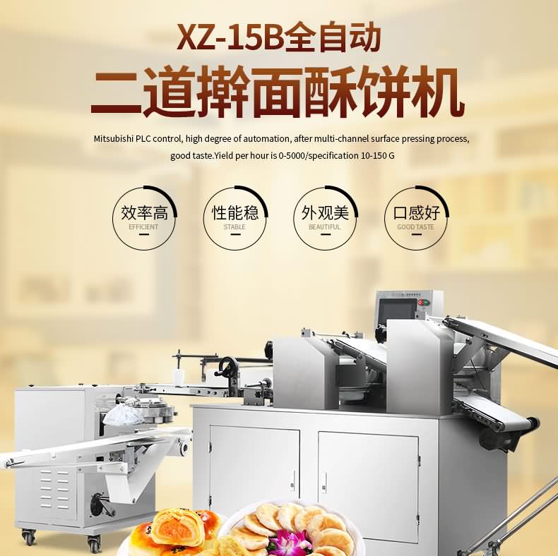 XZ-15B二道搟面酥餅機,生產速度快、效率高、生產流程流暢,各環節都輔以電控設備控制,不會出現堵面、破酥等現象??缮a蘇式月餅、肉松餅、老婆餅、廈門餡餅、金華酥餅、拉絲面包等等特色酥餅,適用于大、中型糕餅生產廠家,免費提供工藝技術。