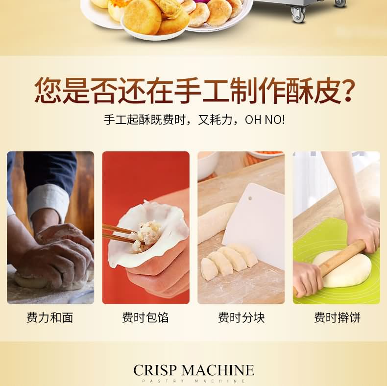?生產速度快,效率高,生產流程流暢,各環節都輔以電控設備控制,不會出現堵面,破酥等現象;