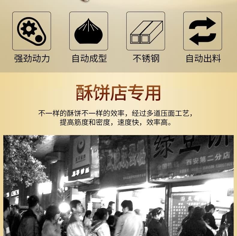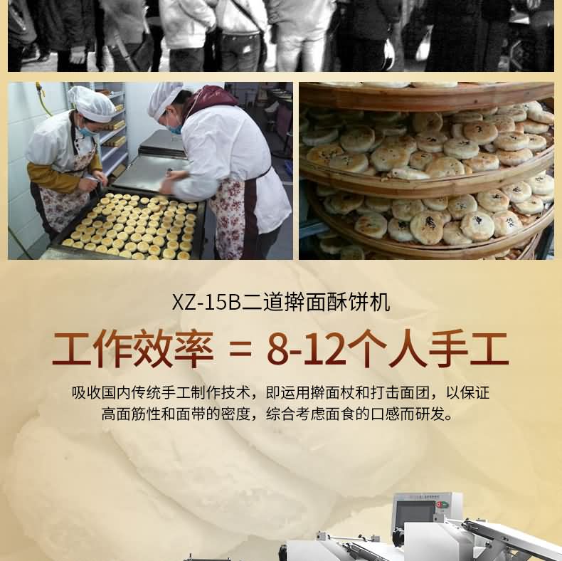 旭眾牌XZ-15B二道搟面酥餅機是我公司仿手工制作面食產品的機型,占地面積小,重量輕,它吸收國內傳統手工制作技術,即運用搟面杖壓面和打擊面團,以保證高面筋性和面帶的密度,并綜合考慮面食的口感而研發。