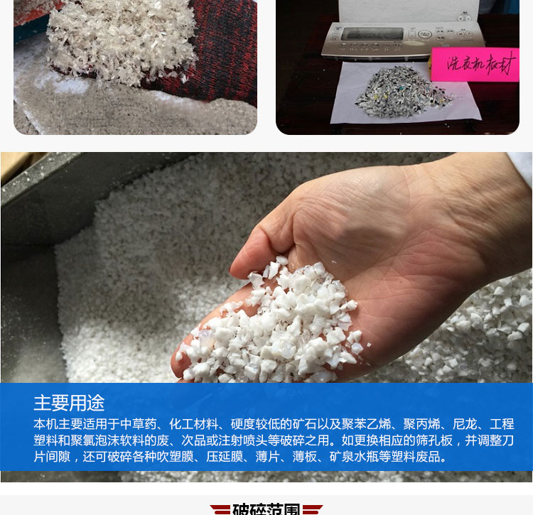 不銹鋼破碎機(jī)適用于中草藥、化工材料、硬度較低的礦石以及聚苯乙烯、聚丙烯、尼龍、工程塑料和聚氯泡沫軟料的廢、次品或注射噴頭等破碎之用。如更換相應(yīng)的篩孔板,并調(diào)整刀片間隙,還可破碎各種吹塑膜、壓延膜、薄片、薄板、礦泉水瓶等塑料廢品。
