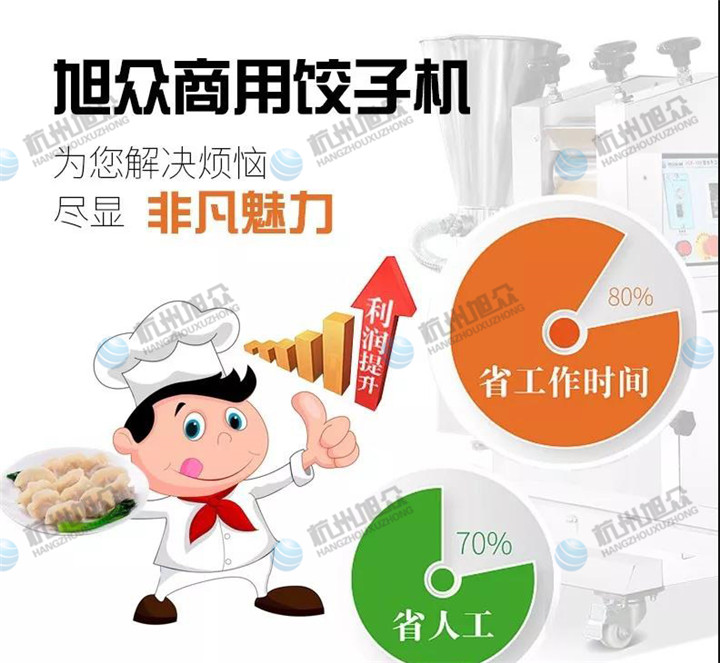 旭眾全自動商用餃子機打破傳統手工包餃子的模式,由機器替代人工,大大提高了工作效率和產品質量高效率生產。小資本投入,高效收益。一臺餃子機讓你省工作時間,省人工費。這其中的利潤空間是可觀的。