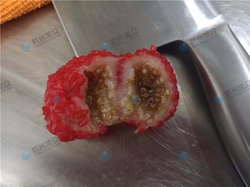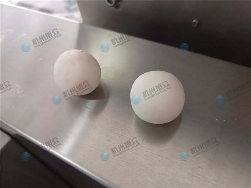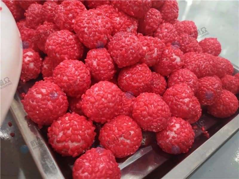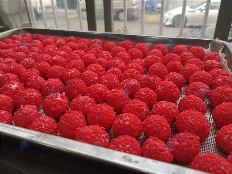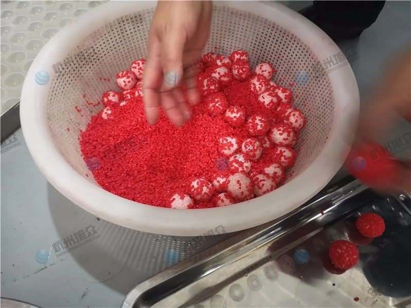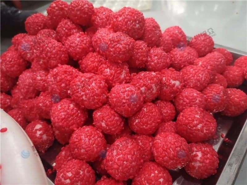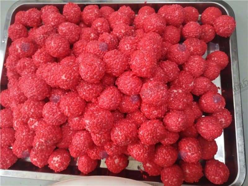 因為餡料、面皮都可是客戶自己準備帶來現場的,所以直奔主題,需要搓圓做成團子形狀,之后再人工裹紅米,因為不帶擺盤的VFD-4000A湯圓機當時沒有樣機,所以安排VFD-4000湯圓機(帶擺盤)做團子。