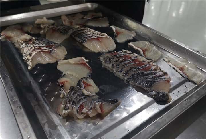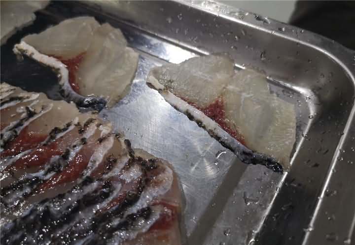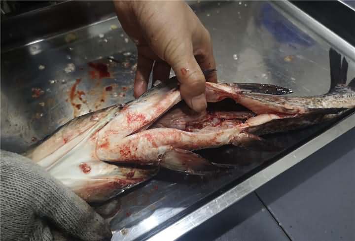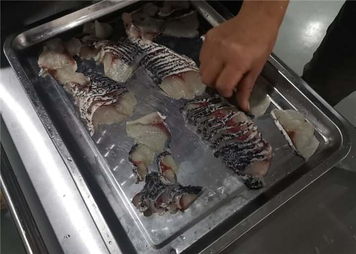 魚(yú)鱗去的是很干凈,但是魚(yú)鰓蓋上的魚(yú)皮有些破損,因?yàn)榭蛻?hù)做的也不會(huì)剁椒魚(yú)頭類(lèi)的,所以對(duì)于這些小破損也不介意,試完后發(fā)現(xiàn)有魚(yú)片機(jī),便想著白鰱反正都已經(jīng)殺好了,用切魚(yú)片機(jī)片魚(yú)片看看效果,于是也給安排上了切魚(yú)片機(jī):
