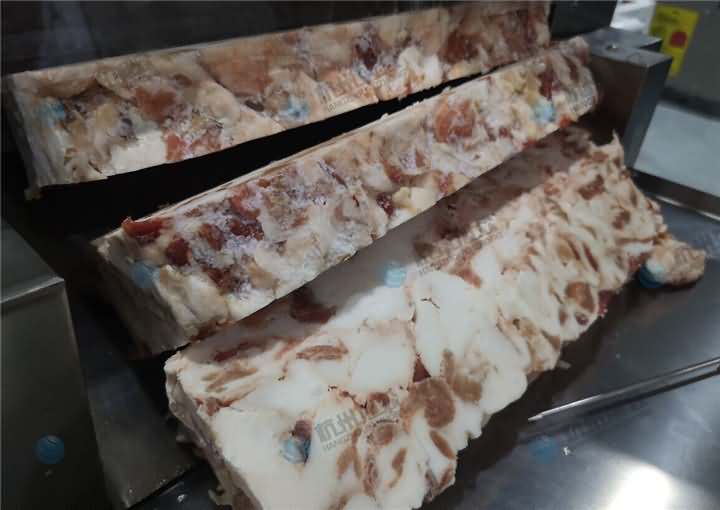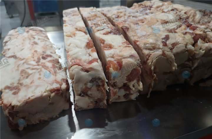 今日上門考察設備的客戶急忙從冷庫中帶了一大塊的凍肉過來,說應也不是特別硬,部分其實都有點化掉了,要求是機器將它切成長條塊就行了,后面切好的塊人工再加工下再放入絞肉機絞碎就行,客戶說主要凍肉人工去切這么一大塊太費勁了,于是根據他的要求推薦了牛羊肉切卷機,該機本身就是切凍肉,切片越薄肉卷就容易成卷,不過切的越厚就直接是塊了,該機切片厚度可調整,于是將它調制成5公分的厚度,那么我們來看看牛羊肉切卷機切凍肉塊效果: