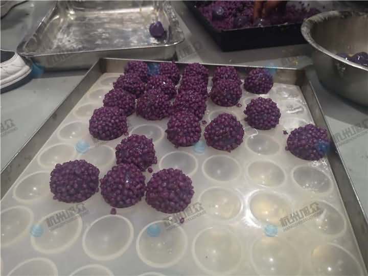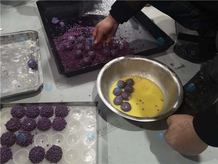 輕松制作紫薯球選擇旭眾湯圓機(jī),本來想用VFD-4000A湯圓機(jī)制作,卻因現(xiàn)場(chǎng)樣機(jī)演示問題,只能用VFD-4000湯圓機(jī)制作紫薯球過程: 紫薯球外表裹完蛋液還需要裹雜糧米,所以VFD-4000湯圓機(jī)的擺盤工具沒有放上去,由人工去接盤后,再裹蛋液裹米: 因?yàn)榭蛻羰亲雠渌偷?,只需要將紫薯球做成型便可,至于紫薯球是要蒸還是煮還是炸,這個(gè)屬于后期的工藝!
