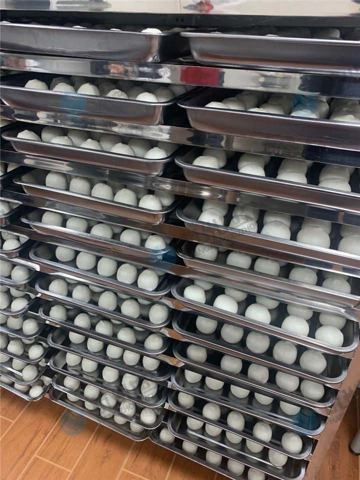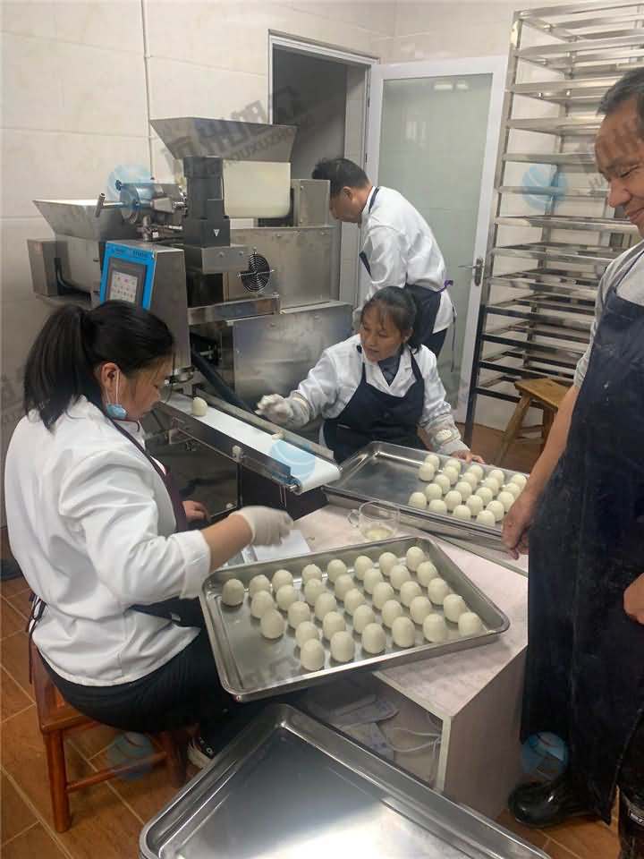 來自富陽的許老板帶著員工一起跟著師傅學習操作多功能包餡機,歷經幾個小時的培訓,終于步入員工和老板都能操作包餡機生產熟米粿正軌上,看著一排排的熟米粿,許老板不經感嘆到,以往得安排四五個員工花至少也得半小時時間才能做出這么多量,如今只要安排一兩人和面拌餡,一人撿盤擺盤放盤便可,效率也是蹭蹭蹭的往上漲,早知如此就該早點買包餡機