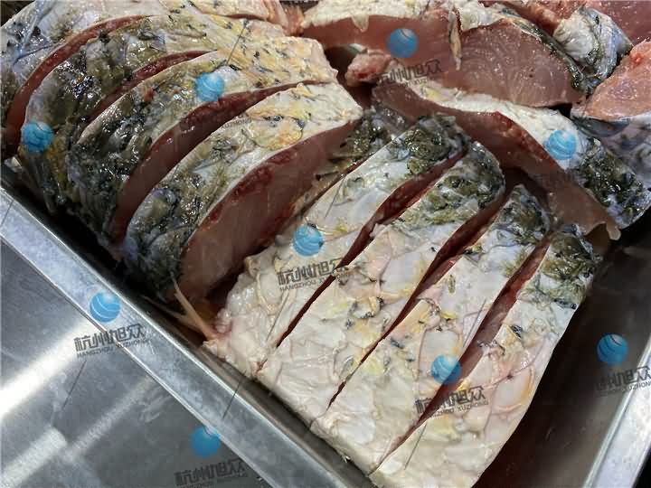 草魚剁塊選擇XZW-130禽肉類剁塊機,該剁塊機專業剁帶骨肉類食品,但除了大骨、豬蹄以外。禽肉類剁塊機分為丁刀組和單刀組,丁刀組剁的是方塊形,而單刀組則是直接塊,丁刀組對于物料要求高,需要物料冷凍后剁塊效果才明顯,就好比如雞架,如若直接將新鮮的雞架通過禽肉類剁塊機剁塊,那就會產生嚴重的連刀現象,一個刀不會直接切到釘板上,因為這樣釘板很容易報廢掉,二個就是雞皮本來就很有韌性,你讓人工去手撕雞皮也得費很大的勁,所以如果需要用丁刀組去剁雞塊、鴨塊的話物料要冷凍哦!而單刀組對于物料的要求就沒有那么高,醬板鴨、鹽水鴨、草魚剁塊用單刀組剁塊效果非常好,那么我們先來看看XZW-130禽肉類剁塊機剁草魚塊效果: