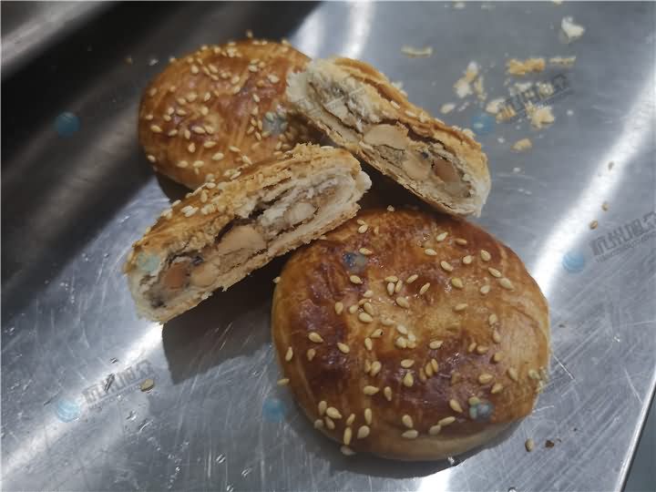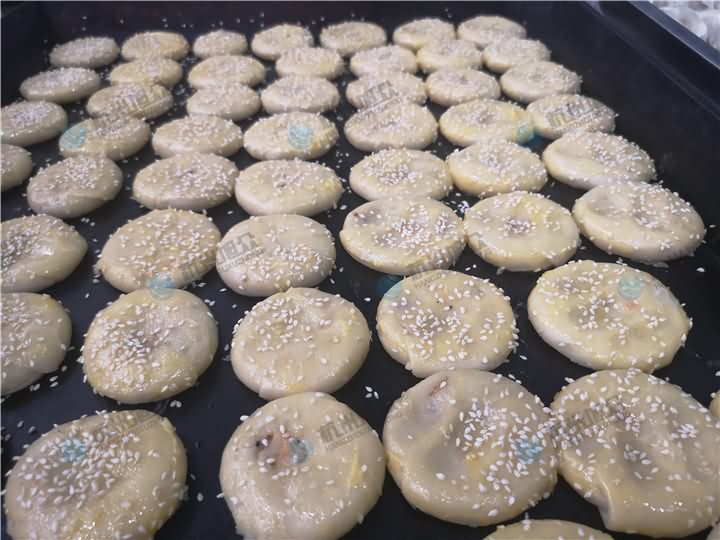第二張圖是酥餅機批量生產(chǎn)的酥餅,再由人工后期抹一層蛋黃再撒上白芝麻