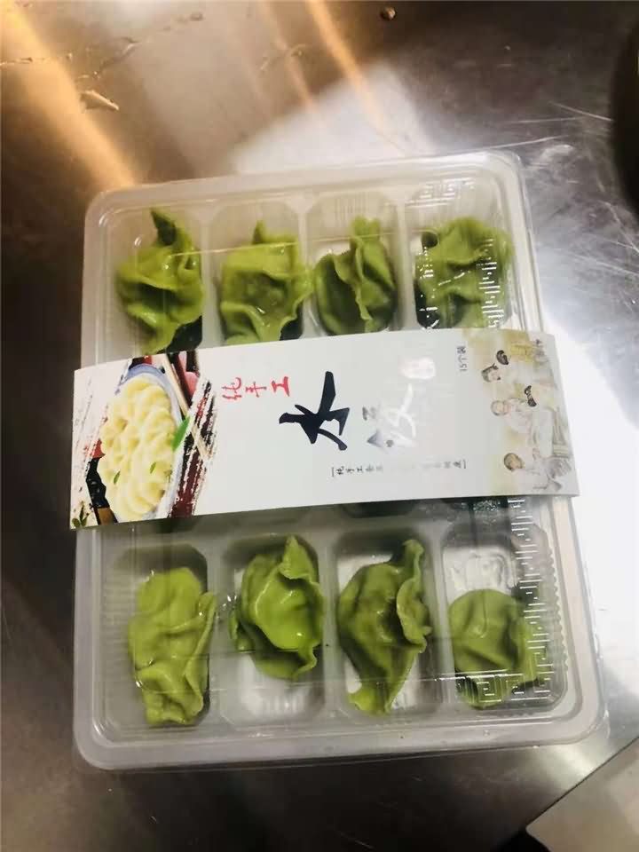 是韭菜肉餡,菠菜南瓜紫薯分別榨汁和面做皮,仿手工餃子機成型,完美
