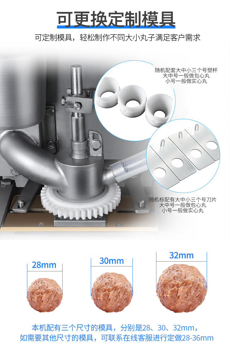 肉丸成型機為包餡肉制品成丸設備,能生產出各種大小尺寸的包餡魚丸、撒尿牛丸、豬肉丸、牛肉丸、及包餡貢丸等,并可做不包餡的各類丸子。該設備具有速度快、衛生方便、易拆洗等特點,可代替幾十個人手工生產,可為廠家節省人員的投入、提高生產速度。