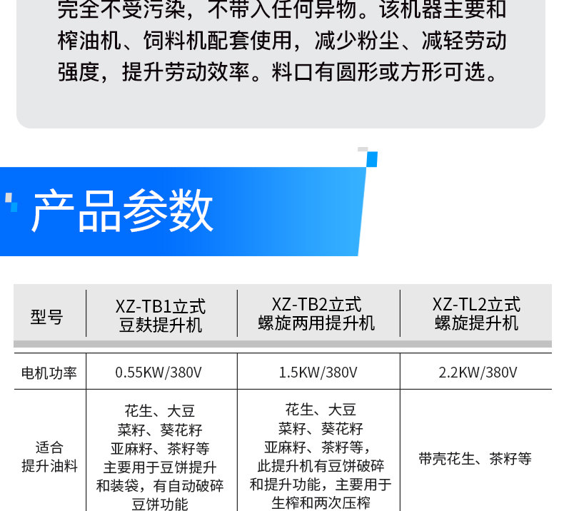 適合提升油料 | 花生、大豆、菜籽、葵花籽、亞麻籽、茶籽等,主要用于豆餅提升和裝袋,有自動破碎豆餅功能 | 花生、大豆、菜籽、葵花籽、亞麻籽、茶籽等,此提升機有豆餅破碎和提升功能,主要用于生榨和兩次壓榨 | 帶殼花生、茶籽等 |
