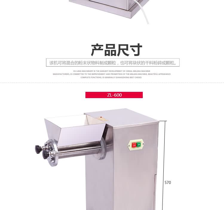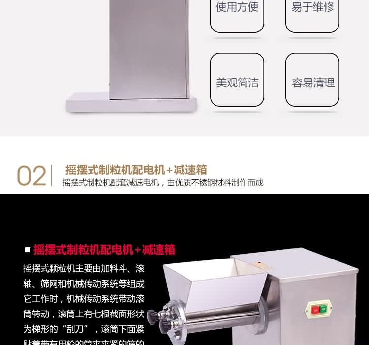 搖擺式顆粒機運行時,加料理和篩網位置的松緊直接影響制得顆粒的質量。加料斗中加料量多而篩網夾得比較松時,由于滾筒旋轉時能增加軟材通過篩網的次數,均能使得的顆粒堅硬。