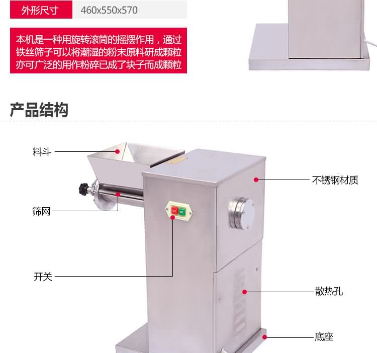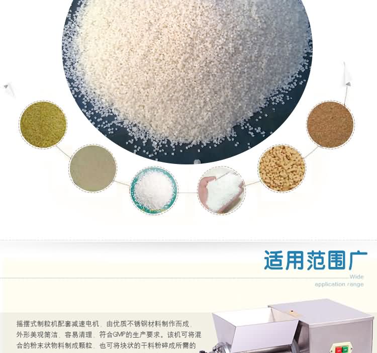搖擺式顆粒機可將混合的粉末狀物制成顆粒,也可將塊狀的干料粉碎成所需的顆粒。搖擺式顆粒機適用于制藥廠、化工廠、食品廠、科研單位、實驗室、醫院、保健品廠批量生產。搖擺式顆粒機整機全部采用優質不銹鋼制造,符合GMP標準。